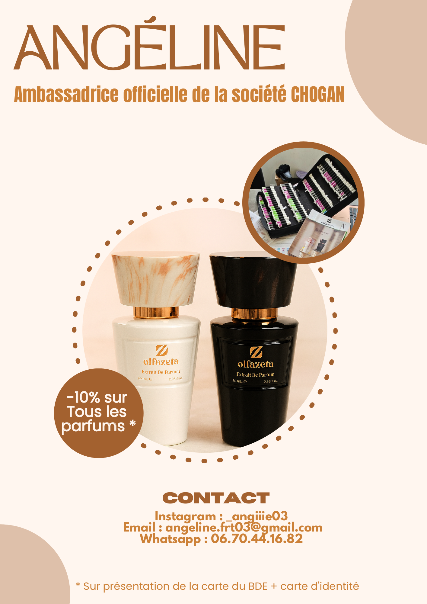 Grâce à ce partenariat exclusif, tous les membres du BDE ont la chance de bénéficier d'une réduction de 10% sur l'ensemble des parfums Chogan. Pour profiter de cet avantage, il vous suffit de présenter votre carte BDE à jour accompagnée d'une photo d'identité. Que vous soyez à la recherche d'un parfum pour femme, homme ou mixte, Angeline, en tant qu'ambassadrice, sera là pour vous guider dans votre choix. Ce rabais exclusif s'applique à toutes les fragrances de la marque, permettant ainsi à chacun de découvrir et de savourer les délicates senteurs Chogan.